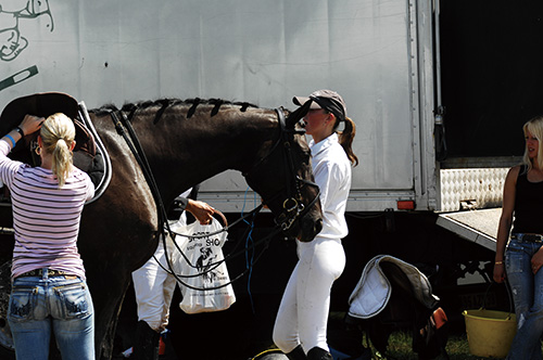 在比赛期间,确保马匹安全地运到目的地是一个很重要的环节。因为在运输过程中,除了防止马匹受伤之外,还要考虑马匹的脱水现象。一般情况,马匹在车上超过12个小时,水分消耗会在5%以上。这就需要我们在启程之前和到达目的地之后都要做好充分的准备工作。