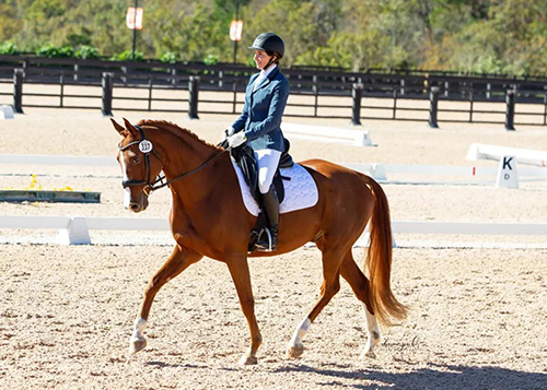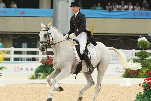 从上面的图片可以看出,马和骑手非常专注。马匹看起来非常柔软,对骑手的辅助也非常服从。从马四肢可以看出,马匹的步伐充满弹性;再去看到马的臀部,有旋转的动势,说明马的背部灵活柔软。也可以看出这是一匹年轻马,因为它的肌肉还没有像成熟舞步马那样圆、发达,但是作为一匹年轻马,它的运动方式,头和颈部的位置非常好。