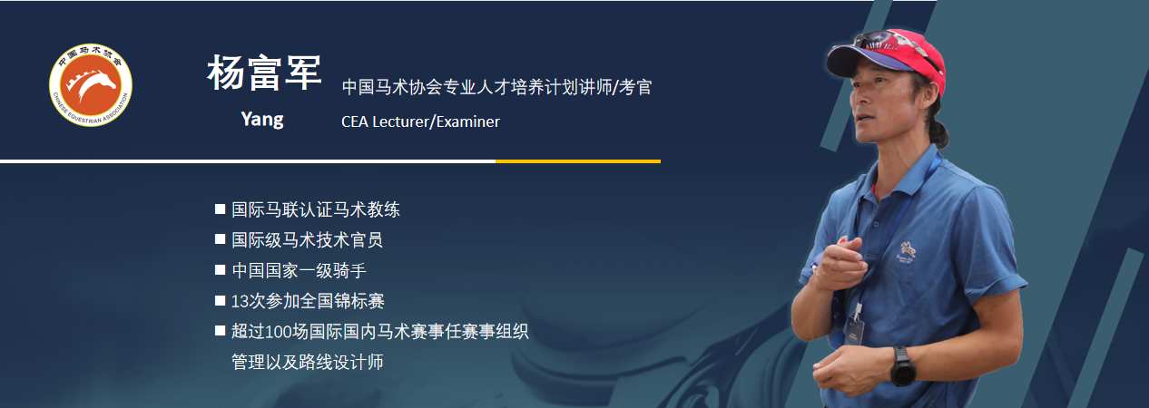 杨富军老师有多样的国际马术学习背景和丰富的大赛经历,也曾13次参加全国锦标赛,参与超过100场国际国内马术赛事并任赛事组织管理以及路线设计师。
