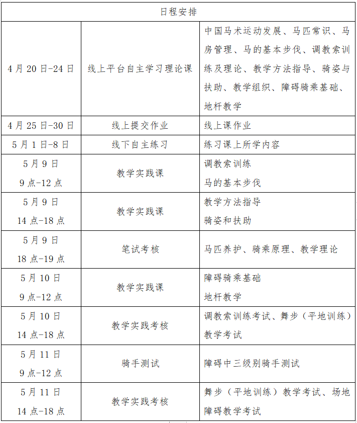 线下辅导和实践考核:2022年4月18日-20日,在北京骑缘国际马术俱乐部进行线下集中辅导与实践考核。