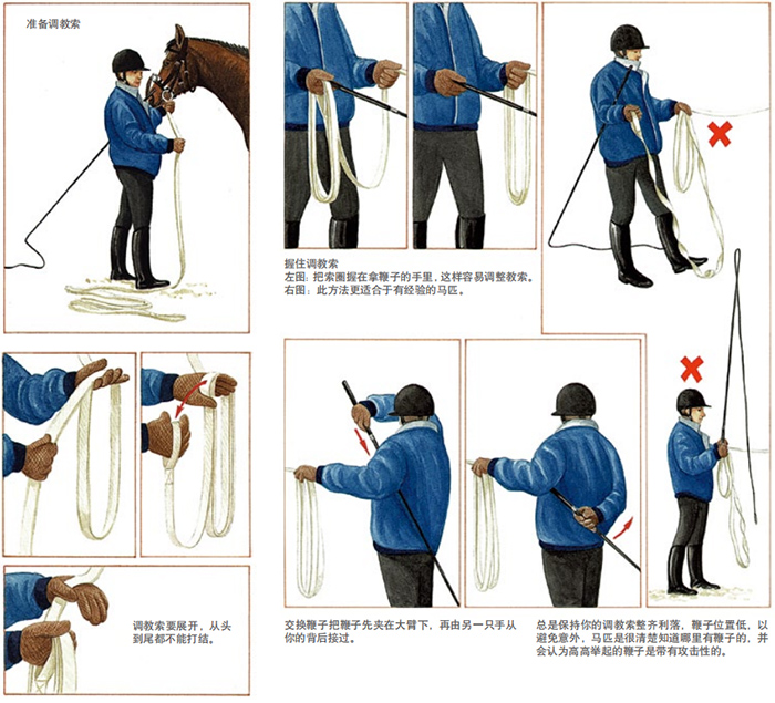 绝不可使用别人已缠绕好的调教索,必须要自己缠绕。从左侧开始,多数的马匹在这个方向都会乐意合作。骑手站在马匹左侧,用左手握住调教索在靠近头部的位置,并将余下的调教索抛到一边,以免骑手本人或者马匹踩到。将调教索卷绕在你的左手上,索圈一定要大小合适,脱离地面,而且索圈要足够大,不可紧绕在手上。当你缠在尾端时,用右手握住柄套,把索圈从左手换到右手,再翻过来,因而在放开调教索时,索圈可自顶部展开,而左手便可不慌不忙地或收或放了。你也许觉得将索绳握在中指和小指之间的位置是最为舒服的,将像骑乘时一样。与马保持不断联系,这个动作只需要几秒钟的时间。换调教索时,重复上述练习,将调教索绕在右手上,再将索圈转到左手上。