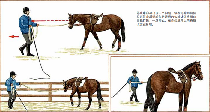 右手握鞭及调教索圈。与马匹肩部水平站位,鞭子指向马匹后蹄,告诉马“WALK-ON慢步”。你的左手手指必须允许调教索随着马匹慢步向前滑动,从而走成圈蹄迹线,慢步到马匹进入了圈蹄迹线,并用鞭子轻轻促使马保持步伐向前,一旦马匹行进到圈蹄迹线里,你可以要求马做“快步”。让马尽可能地走大圈。练习一些快步带慢步,快步到停止的变换,之后向前再变成快步。决不能允许马匹转向你所站的方向。一旦你感到左边已控制好,让马停下来然后换到右边。确保调教索卷绕正确。多数马匹在右边行进时不太敏感,并且总试着对着你。向马匹的后躯方向移动,但也不要太过接近,以防止马后踢。让马匹步伐向前,确保利用调教索引导马匹向前。如果马匹在左右两个方向都能够放松行进时,就系上侧缰,以帮助马匹用正确的外形姿态工作。这样做有利于马匹肌肉的发展及行进方式。先将侧缰系在右侧,这样的话,即使马匹逃脱,仍可给予更多的控制。利用步伐变换及频繁的换方向进行练习。