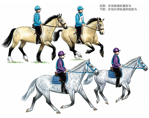 然而,在耐力骑乘中有很多马与这些理想的特征相差甚远。竞技场上常常能看到重型马、小型马、纯血马和各种中间类型的马。可以公平地说,那些步伐有缺陷、运动特别或天生体格沉重和肌肉丰满的马,长距离和快速度运动的确比较吃力。