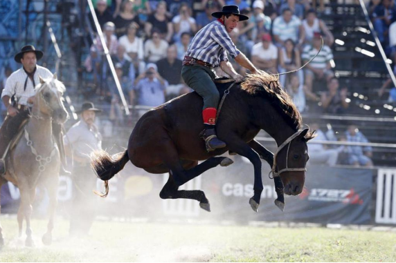 比赛时,每个参赛者骑上一匹野马,该马被关在一个栏道里,当骑手准备就绪时,打开大门,马会突然爆发,野马试图将牛仔摔倒。