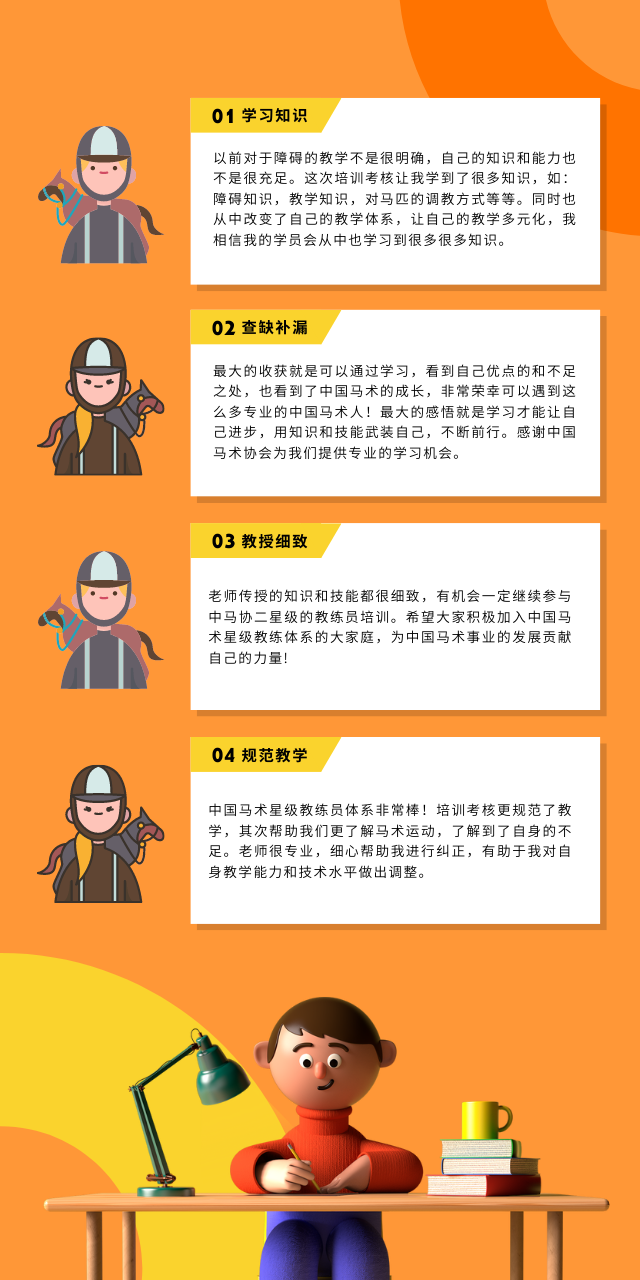 对于线上教练员培训考核,学员们给出了积极的反馈意见。我们也将继续创新课程模式、优化课程设置,为学员们带来更多专业化培训。马术教学因材施教,教学方法、专业知识和技能都非常重要。中国马术协会与学员们携手同行,共同推动中国马术更美好的明天。