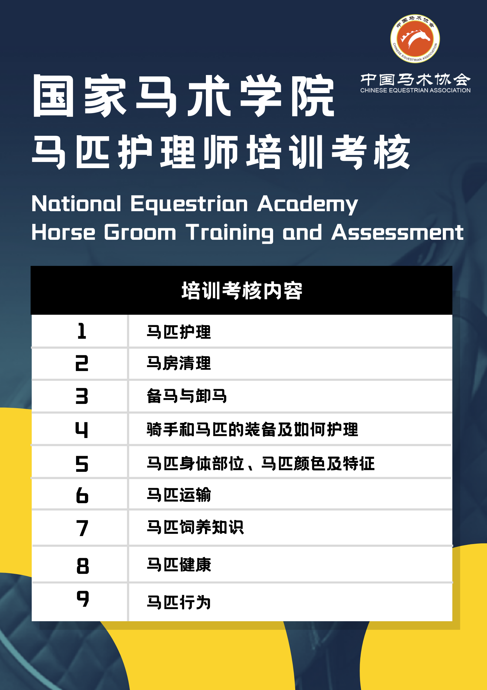 为了贯彻落实习近平总书记对体育工作系列重要讲话和指导精神,深化“体教融合”工作,进一步夯实马术运动发展的人才基础。中国马术协会与武汉商学院合作共建中国马术协会国家马术学院于2021年12月开班,在教练员、技术官员、马匹护理师等方面开展专业人才培养,为行业输送新鲜血液。2022年6月19日至20日,国家马术学院开办马匹护理师、教练助理培训考核课程,共计60名学员参与。