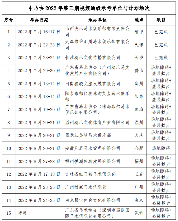 (五)在本期所有承考单位考核视频拍摄上报完成后,中国马术协会组织考官评审打分,通过考核的等级名单将在官网公示。