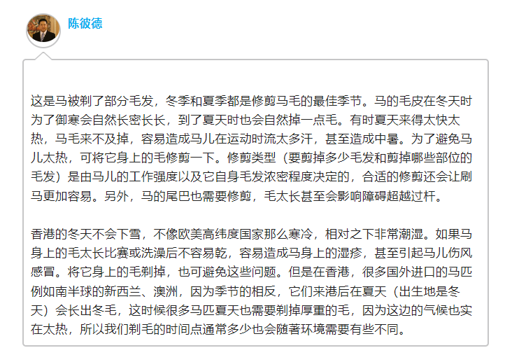 问:夏季和冬季在香港看赛马,有的马的肘部以上明显毛色变浅,这是什么情况?