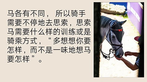 “我永远不会觉得马做错了什么。马骑不好,是我的责任,这该是我的工作。而且,我不会苛求我的马。每匹马都不同,我不会按照一个标准去要求所有马。”王韫婧为此还举了一个例子,“假如你有一个一米六个子的朋友,你不能要求她长到一米七。如果她突破不了生理极限,你难道还要去责怪她吗?”