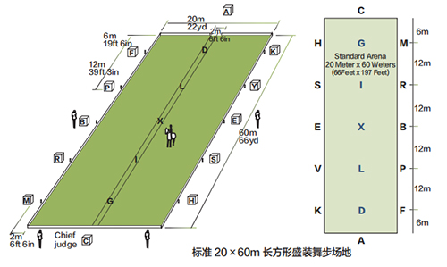 标准的舞步场地是一个20×60m的长方形场地,四周边每隔一定的距离都设有英文字母。短边中央线位置分别是A点和C点。由A点进入场地。从短边到第一个字母的距离为6米,其余长边字母间隔为12米。场地中间中央线上有5个字母是没有标识牌的,但不代表它们不存在。