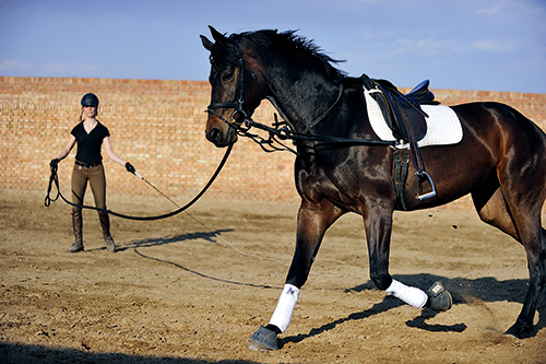 跟骑乘一样,每5分钟就应该换一次方向。这会让马匹在训练科目中多一些变化,负载均匀,调教师还可以通过调整侧缰的长度来为马匹提供多种不同步伐的训练方式。