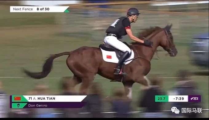 中国骑手华天搭档东京奥运赛驹堂·热内卢(Don Geniro)在比赛中第71位出场,考虑到马匹的身体状况,他们在比赛的中后段选择退赛。