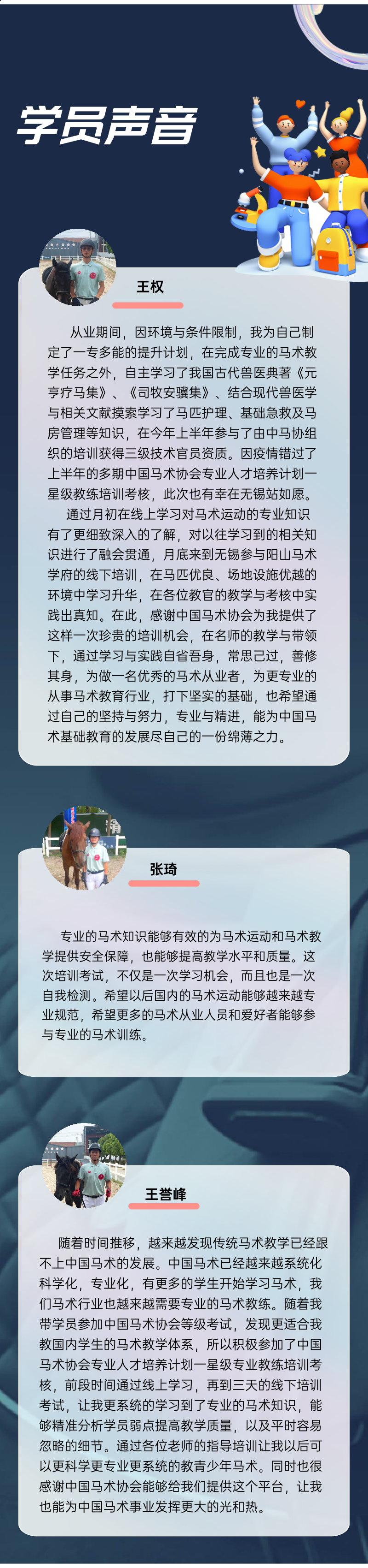 虽然疫情拉开了我们之间的距离,但是更加坚定了我们一齐建设中国马术的决心。学员们以不息为体,以日新为道,积极上进。讲师们也是秉承着“君子诲人不倦,而师道必严”的思想,不留余力地倾囊相授。中国马术协会也会为学员们提供更优质的平台,让每位学员可以收获更多知识,辅助学员在职业道路上走得更远。