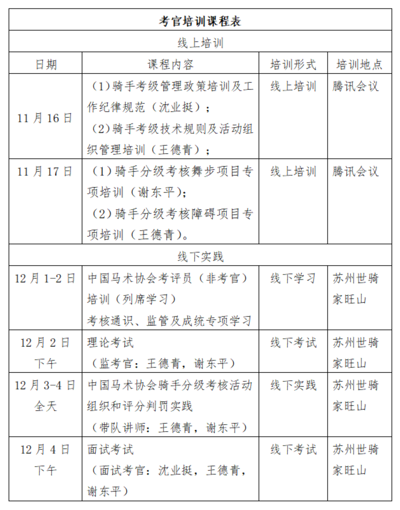 为满足中国马术协会骑手考级项目需求,推进考级项目人才梯队建设,规范考评工作标准,我协会将举办马术考级项目考官培训,现将本次培训考核相关事宜通知如下: