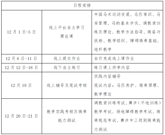 马术一星级专业教练培训考核将于2022年12月1日-21日在线上开班。本次活动以线上方式进行培训与考核,中外专家联合授课。考核合格者将被授予中国马术一星级专业教练员能力水平证书,并可进一步申报全国初级教练员岗位班,经考试合格后获取初级职称。