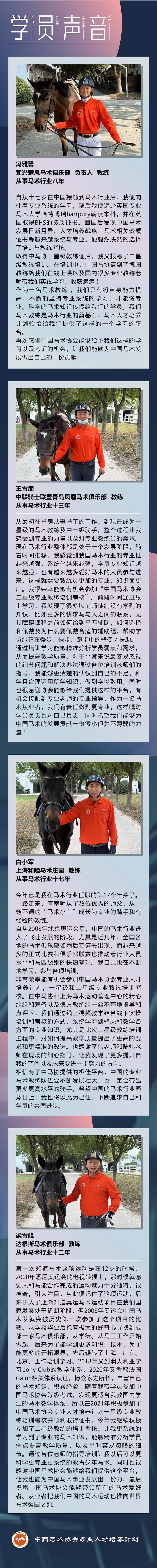 学员的声音是对于星级教练不断推进的支持和鼓励,未来中国马术协会专业人才培养计划会继续砥砺前行,不断完善星级教练的培训内容和方式,为中国马术事业培育更多优秀的马术专业人才。