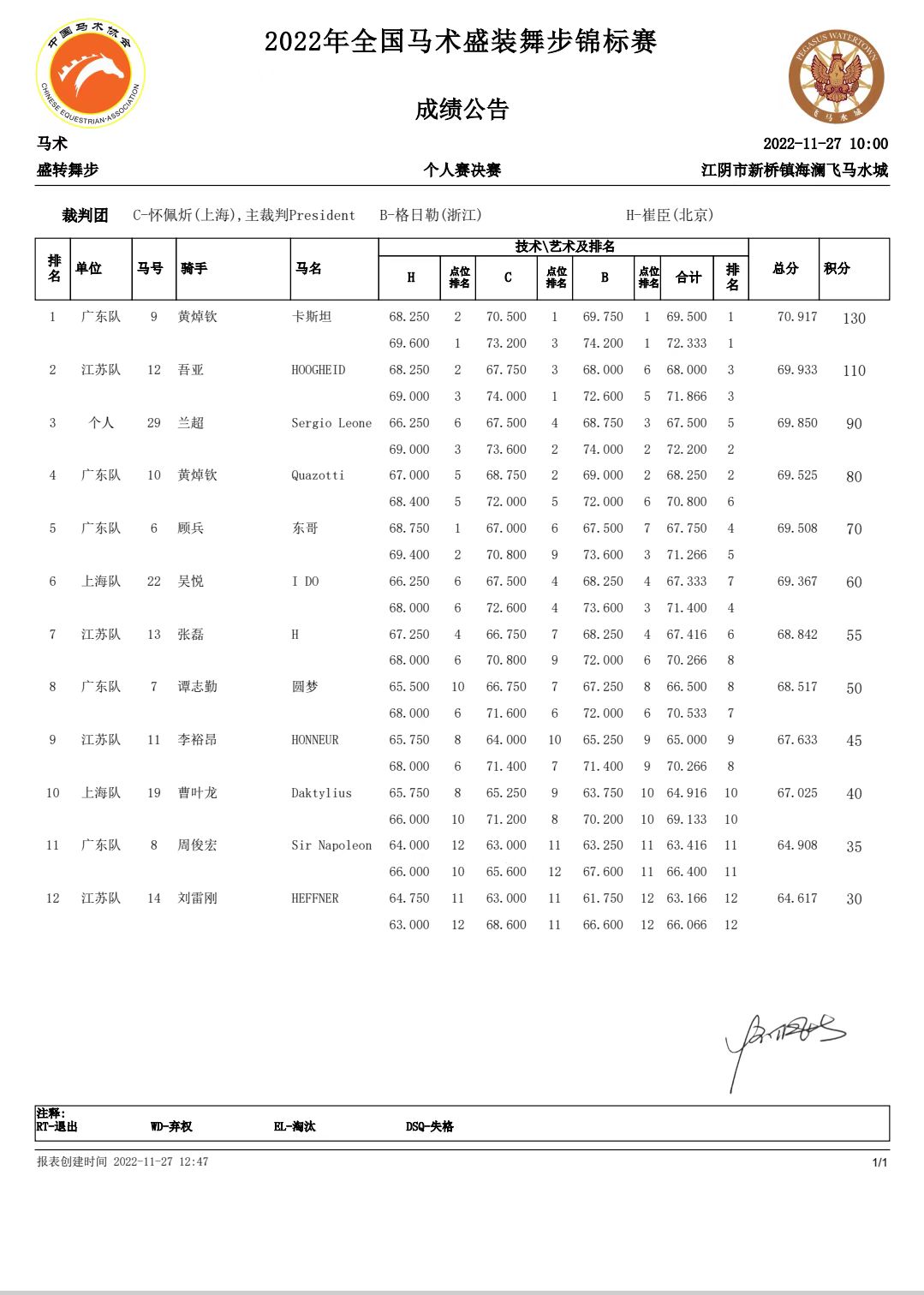 比赛总共31对人马组合参加,历经两轮筛选,最终有12对人马组合进入今天的个人决赛。经过近3小时的紧张比赛,来自广东队的黄焯钦及搭档卡斯坦,以70.917总分的优势获得冠军。来自江苏队的吾亚和搭档HOOGHEID以69.933的总分屈居第二。季军则由兰超搭档Sergio Leone获得。