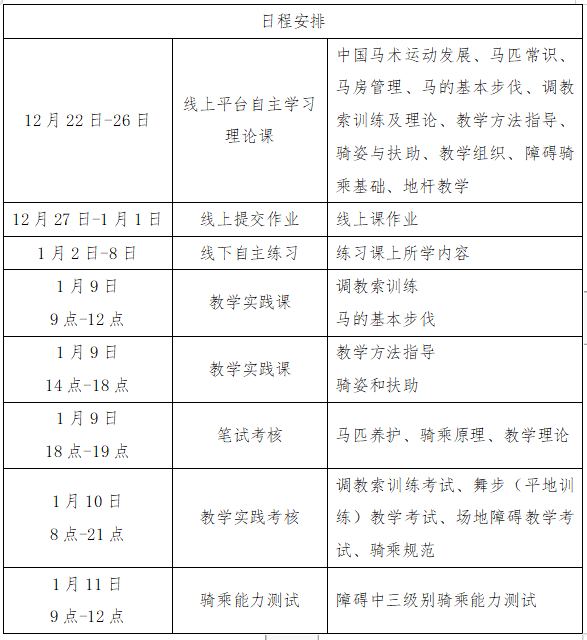 (三)线下辅导和实践考核:2023年1月9日-11日,在世骑家旺山国际马术中心进行线下集中辅导与实践考核。