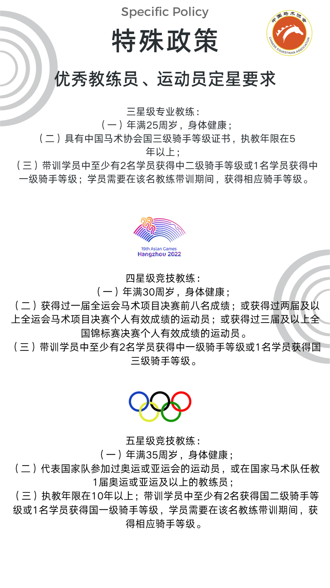 马术运动的发展离不开优秀的教练员、运动员做出的贡献和投入。为了鼓励中国马术运动的传承者,中国马术协会对优秀的教练员、运动员申请教练员技术等级开辟政策通道,本次对有对应历史比赛成绩和教学经验的教练员、运动员进行定向培训定星。