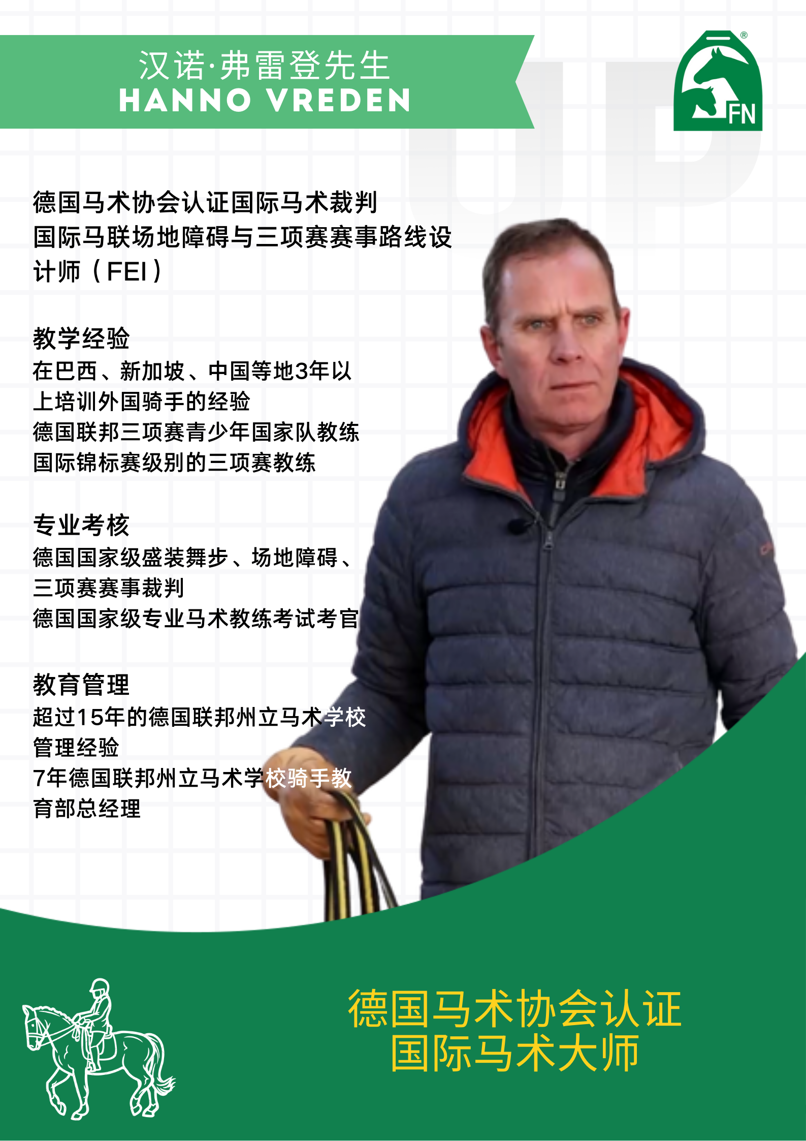 2023年杭州亚运会在即,2024年巴黎奥运会也在向我们招手,中国马术即将向世界展示自己的风采。中国马术协会举办高星级教练培训不仅是为了即将到来的大赛做好准备,更是为了中国马术蓬勃发展做好基础建设工作。为了能够给竞技教练员、运动员一个提升交流马术知识和技能的机会,本次培训邀请到了德国马术协会认证国际马术大师汉诺·弗雷登(Hanno Vreden)先生,德国骑手协会盛装舞步项目主席、盛装舞步国家级裁判沃尔夫冈·埃格贝尔斯(Wolfgang Egbers)先生,德国新生代冠军骑手珍妮特·埃格贝尔斯(Janet Egbers)女士,还特别邀请到德国国家级骑手桑德拉·奥法特(Sandra Auffahrt)女士来华,与大家共同探讨马术教学、切磋马术技术、传授马术运动的宝贵经验,共同见证中德双方的马术友谊,为大家带来悉心准备的课程内容。