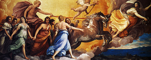 《黎明女神》(又译为《曙光女神》),雷尼用拉斐尔的神话故事风格诠释了阿波罗在黎明女神的引导下,驾驶跃动的战车,给大地洒满阳光的画面。画中人物、马等对象结构严谨,不失古典主义之风,细腻的表情下,饱含抒情意味。四匹飞腾的战马,将画面的云层上与人间蓝天自然衔接,强烈的动态感,带着人们的视线、思绪而跳动,产生鲜明的节奏,而这之下,一股由里到外散发着的生动的戏剧性气息让人们驻目而叹。将视线拉近,四匹战马尤为引人,好似整个绘画的中心。在直曲刚柔的外轮廓下,柔婉与力度交相辉映,在色彩与线条的完美配合中,战马的肌肉强健,动感十足,神情坚毅笃定,姿势舒展有力,使人不禁为之动情。其将巴洛克艺术表现得淋漓尽致的同时,战马的英姿飒爽,强劲中依然带有丝丝柔美的造型,随着高抬的前蹄奔入视线,踏入人们的心里。再加上戏剧性的光线,整幅画面动感不失和谐,力量不失柔美,强烈的情感贯穿始终,好似伴随着战马跃动的节奏,演奏着一首浪漫主义的大提琴协奏曲,三个乐章张弛呼应,和谐动人。
