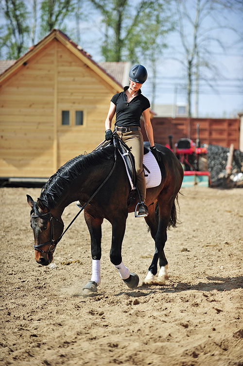 重复一到两次之后,试着换个方向,继续同样的练习。几次后,变换成轻快步,放长缰,让马体充分伸展。这也是年轻马匹必须要经历的,这样才能真正进入工作状态。