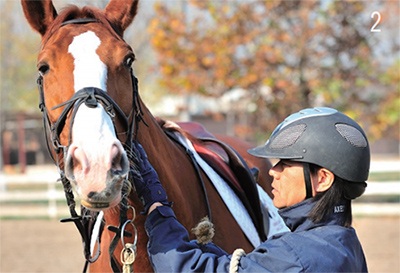 图2中,驯马师更换了一条更长并且分量更重的调教索,这在随后的长缰打圈练习中有用。首先,将马鞍两侧收起的脚镫放下来,以便让马匹感受到脚镫的摆动;然后把缰绳在鞍头相互交叉,在鞍尾固定,使其下垂的位置和骑手手部摆放的位置相类似。(马术杂志)