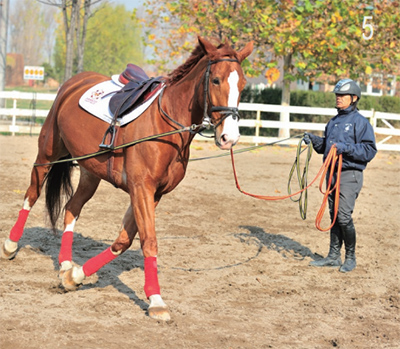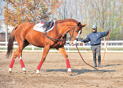 如图5,驯马师在马匹口衔铁的两侧各固定了两条调教索,并将外侧调教索绕到马匹后肢的后面。有些驯马师习惯把调教索直接拴到口衔铁上,在骑马的时候,缰绳也是要固定在衔铁上的,所以在训练的时候,他们认为没有必要把调教索系到调教笼头的鼻革上,但是这需要很高的技术要求,要保证调教索与马嘴的正确接触。