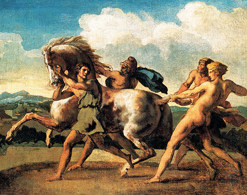 《奴隶与马的较量》的创作灵感,来源于席里柯1816年之后的生活经历。那一年,拿破仑在法国发动的战争宣告失败,面对处于战乱中的故乡,席里柯选择了离开,并在意大利罗马定居。在罗马,他领略到了异国风情的魅力,也平生第一次观赏到罗马狂欢节中著名的表演项目“裸马赛会”(指没有骑手参与的赛马活动)。壮观的表演场面再次激发他创作了一系列以“表现人类同马之间力量与控制”为主题的画作,这幅作品就是当时具有代表性的主题创作。画作于1817年面世,它直观清晰地表达了欧洲原始部落的奴隶掌控马匹的方式,还借助富有张力的跃马动作和奴隶们生动的造型,间接地使读者身临其境地感受到画家在创作画作时的动荡不安、沉郁苦闷的内心世界。(马术杂志)