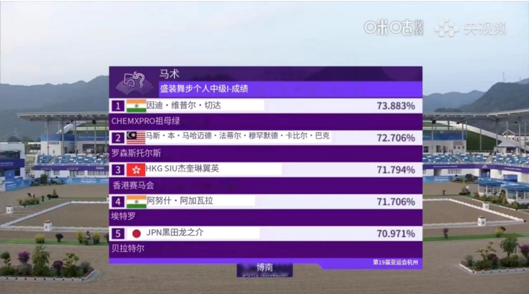 继在杭州亚运会盛装舞步赛团体赛精彩亮相后,中国队兰超、饶嘉怡、黄焯钦于9月27日举行的亚运会马术盛装舞步赛个人资格赛——中一科目的比拼中再传捷报,以优异成绩力取个人决赛资格!