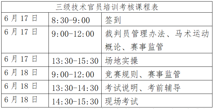 根据马术专业人才培养计划,我协会将与浙江省马术运动协会于2024年6月17日-18日在宁波骑际马术俱乐部举办马术场地障碍三级技术官员培训考核活动,合格者授予中国马术协会相应等级技术官员证。现就本次培训考核相关事宜通知如下:
