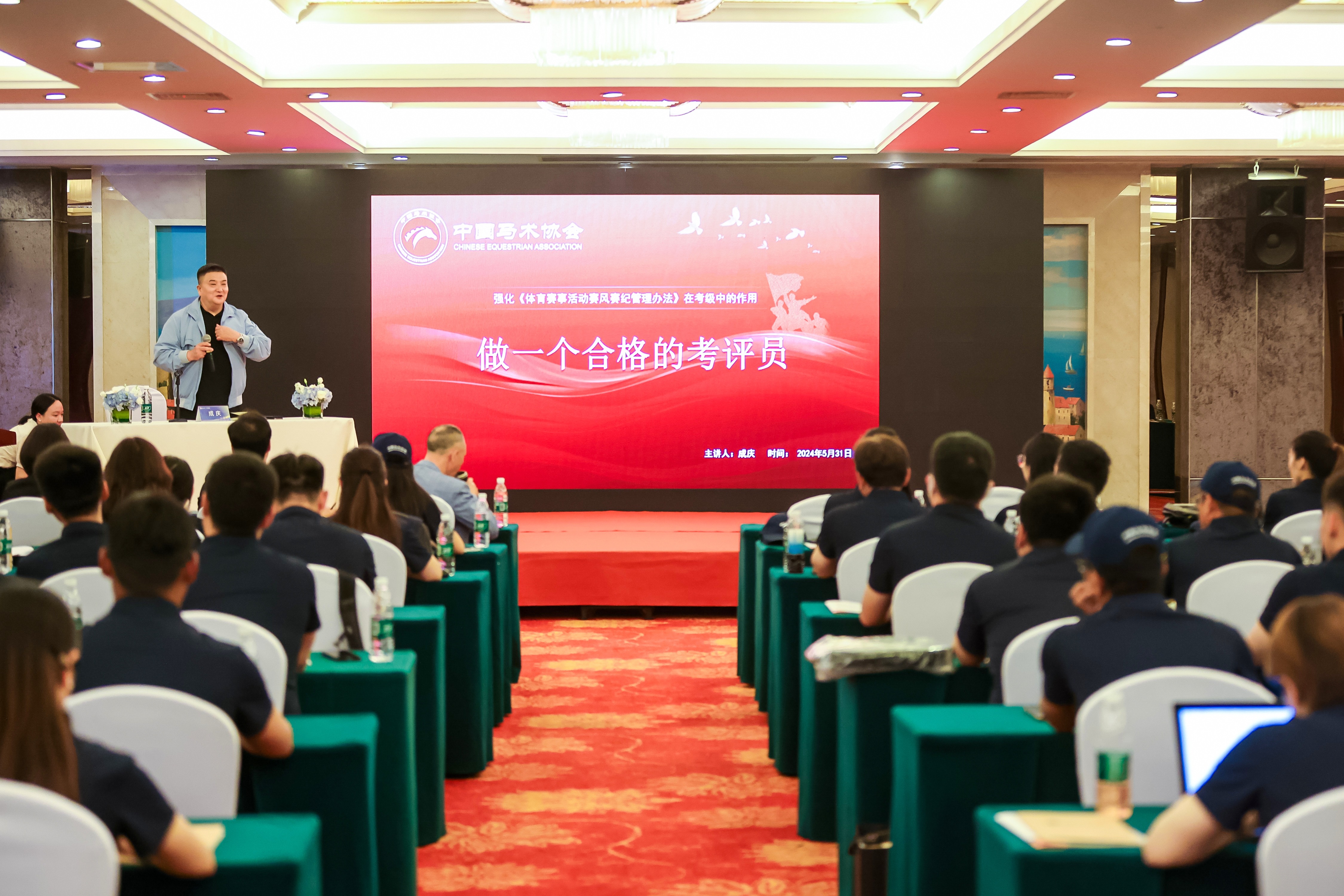 成庆主任随后结合《体育赛事活动赛风赛纪管理办法》进行了专项培训,要求大家坚定信念,做一个合格的考评员。从守好意识形态底线,抓好岗位专业技术以及规范自身道德行为三个方面做了主题讲解,为所有学员进行了纪律规范培训,并结合大量实际案例深入浅出地进行了详细阐述,进一步强调赛风赛纪对项目发展的重要影响,要求大家在活动中维护赛风赛纪,营造风清气正的马术发展环境。