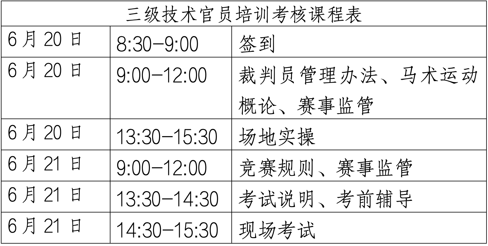 根据马术专业人才培养计划,我协会将与南昌市体育总会于2024年6月20日-21日在南昌百峰岭国际马会举办马术场地障碍三级技术官员培训考核活动,合格者授予中国马术协会相应等级技术官员证。现就本次培训考核相关事宜通知如下: