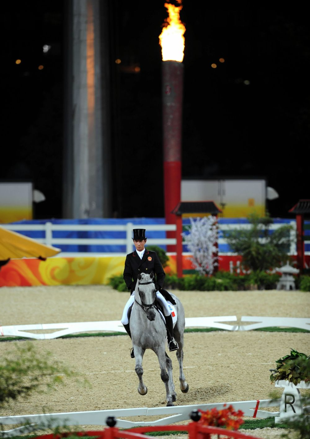 2008年8月9日,中国骑手华天在比赛中。当日,中国骑手华天在香港参加北京奥运会马术比赛三项赛盛装舞步赛,这是中国运动员首次亮相奥运马术比赛场。新华社记者 卢炳辉 摄
