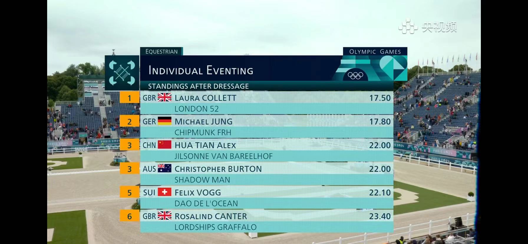 首项盛装舞步赛后,暂居巴黎奥运会马术三项赛个人排行榜前三位的人马组合分别来自英国、德国和中国,澳大利亚并列第三。英国暂居团体成绩榜第一位、德国和新西兰国分列第二和第三位。