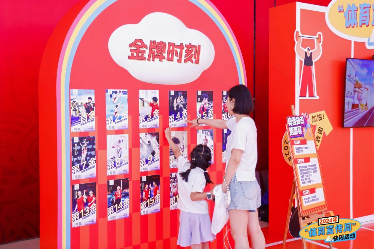 现场互动环节精彩纷呈,设置了丰富多样的内容。“打卡”区精心设计,使用插片式场景搭建和全民健身、巴黎奥运会相关设计元素,打造了适合青年群体的拍照体验区。AR/VR 体验区提供了全民健身主题的设备供民众免费体验,通过跑、跳等趣味运动形式回答体育宣传周相关问题,进行互动。“为巴黎奥运会中国体育代表团加油”区域中,现场游客可写下加油、祝福留言,积极为中国健儿加油。此外,在“水立方”的支持下,展览展示区展出珍贵北京冬奥会相关展品,与“快闪”活动融为一体,营造出浓厚的活动氛围。除此之外,现场还设立了“金牌时刻”区域,时刻展示本次巴黎奥运会中国体育代表团夺金瞬间。