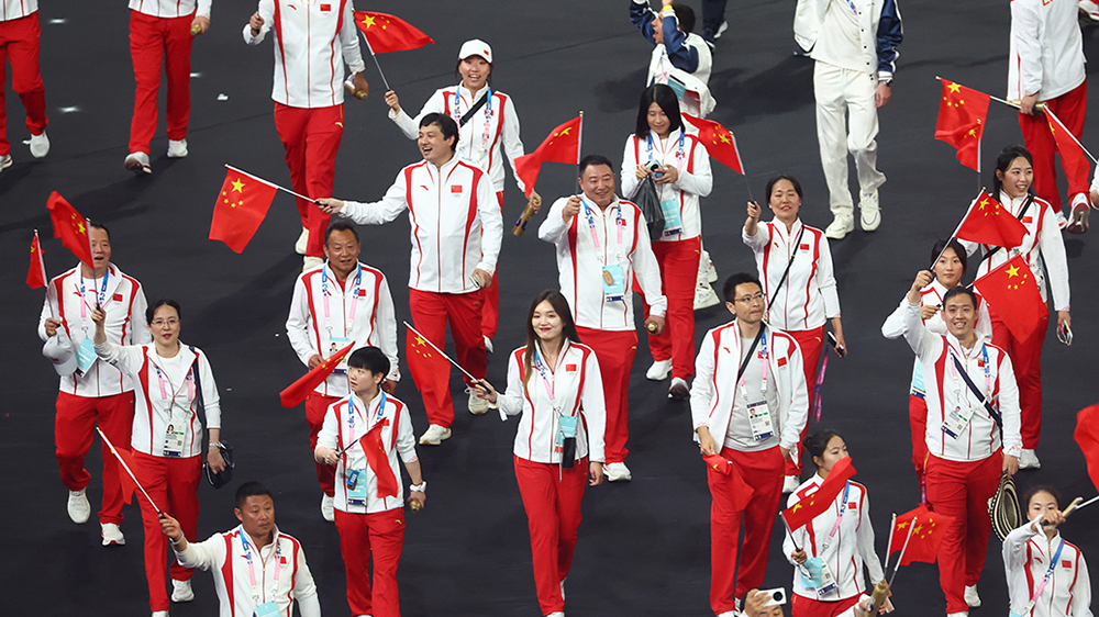 2024年8月11日,法国巴黎,巴黎奥运会闭幕式,中国代表团入场。视觉中国 图