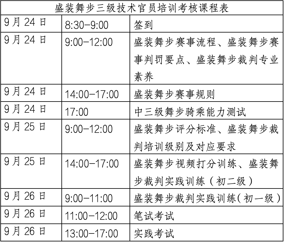 2. 盛装舞步三级技术官员培训考核收取报名费:1650元,如有学员因盛装舞步中三级测试未通过无法参加后续实践考核将退还考核费800元,租马费不退。