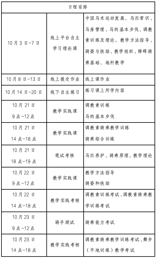 (三)线下辅导和实践考核:2024年10月21日-23日,在重庆和泰马术俱乐部进行线下集中辅导与实践考核。