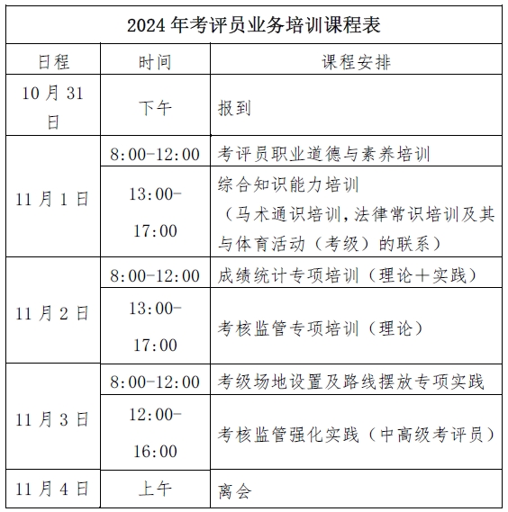 我协会将于2024年10月31日到11月3日在江苏省苏州市世骑家旺山国际马术中心举办考评员业务培训(南方站)。现就本次培训考核相关事宜通知如下: