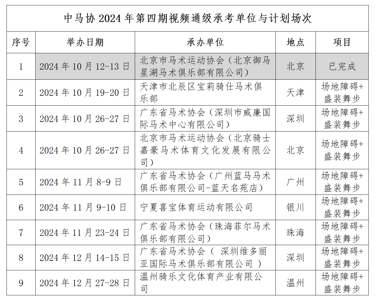 (五)在本期所有承考单位考核视频拍摄上报完成后,中国马术协会组织考官评审打分,通过考核的等级名单将在官网公示。