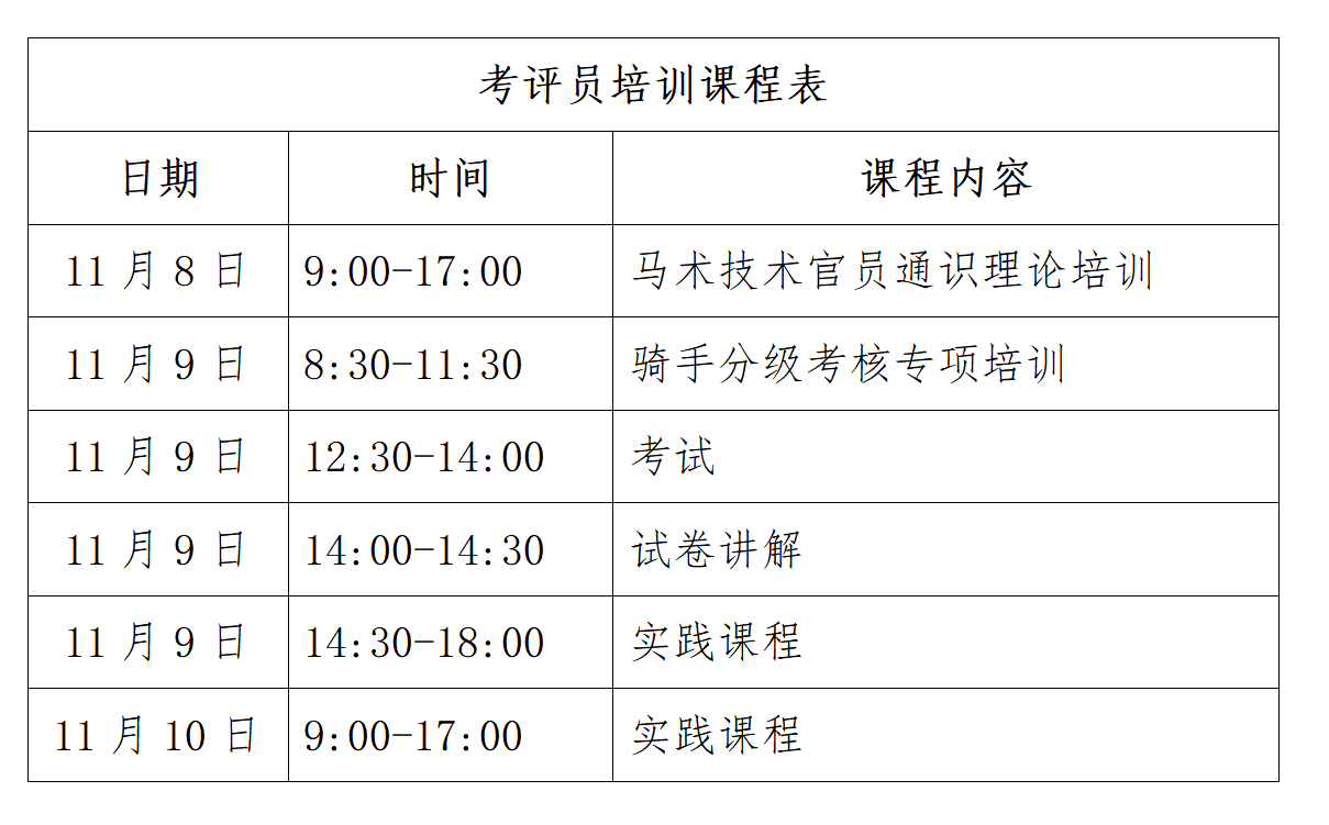 为进一步推进考评员人才队伍建设,我协会将于2024年11月8日-10日在湖北省武汉市国家马术学院(武汉商学院体育学院·国际马术学院)举办考评员培训活动,合格者授予相应等级考评员证书。现就本次培训考核相关事宜通知如下: