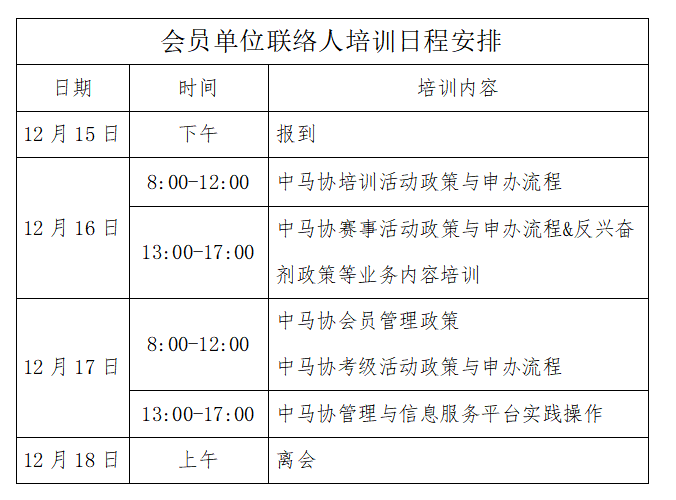 为进一步提高中马协会员单位联络人政策掌握水平与业务对接能力。我协会将于2024年12月16日到12月18日在北京市举办会员单位联络人培训(北方站)活动。现就本次培训考核相关事宜通知如下: