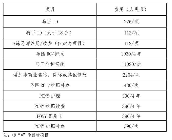 根据国际马联规定,我协会一直为其代收代缴骑手及马匹的相关注册费用,费用标准是根据国际马联发布的收费标准、相关税费及实时汇率制定的。由于国际马联收费标准变更,现我协会变更部分费用标准。明细如下: