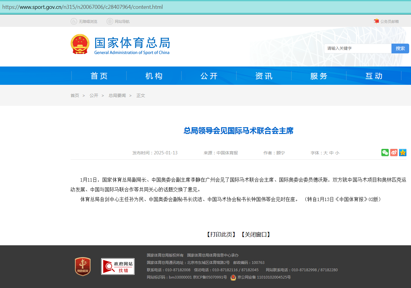 国家体育总局领导会见国际马术联合会主席德沃斯