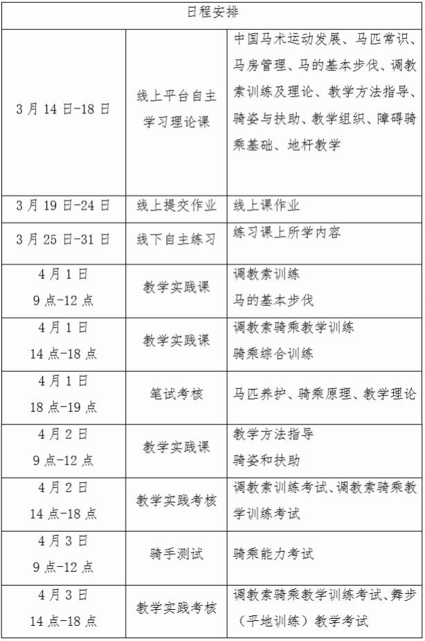 (三)线下辅导和实践考核:2025年4月1日-3日,在天津市骐骥森林马术俱乐部进行线下集中辅导与实践考核。