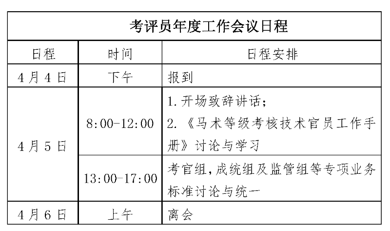 为推进马术考级项目发展,规范考评员工作流程与标准,根据项目整体规划,经研究决定召开考评员年度工作会议。现就本次会议相关事宜通知如下:
