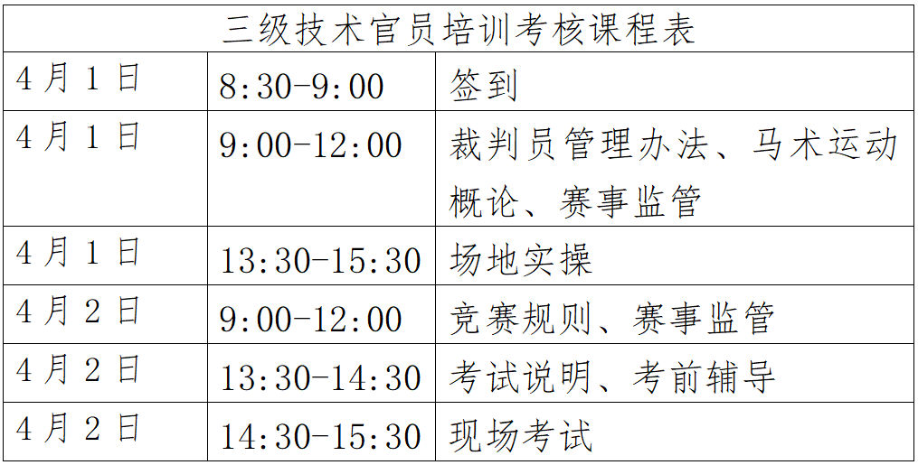 根据马术专业人才培养计划,我协会将与广东川省马术协会于2025年4月1日-2日在珠海科技学院举办马术场地障碍项目三级技术官员培训考核活动,合格者授予中国马术协会相应等级技术官员证。现就本次培训考核相关事宜通知如下: