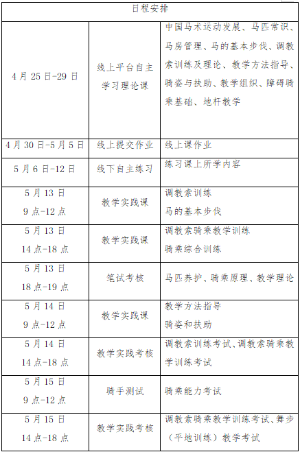 (三)线下辅导和实践考核:2025年5月13日-15日,在逐梦马术俱乐部进行线下集中辅导与实践考核。