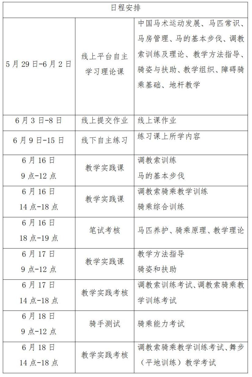 (三)线下辅导和实践考核:2025年6月16日-18日,在天津市兆天马术俱乐部进行线下集中辅导与实践考核。